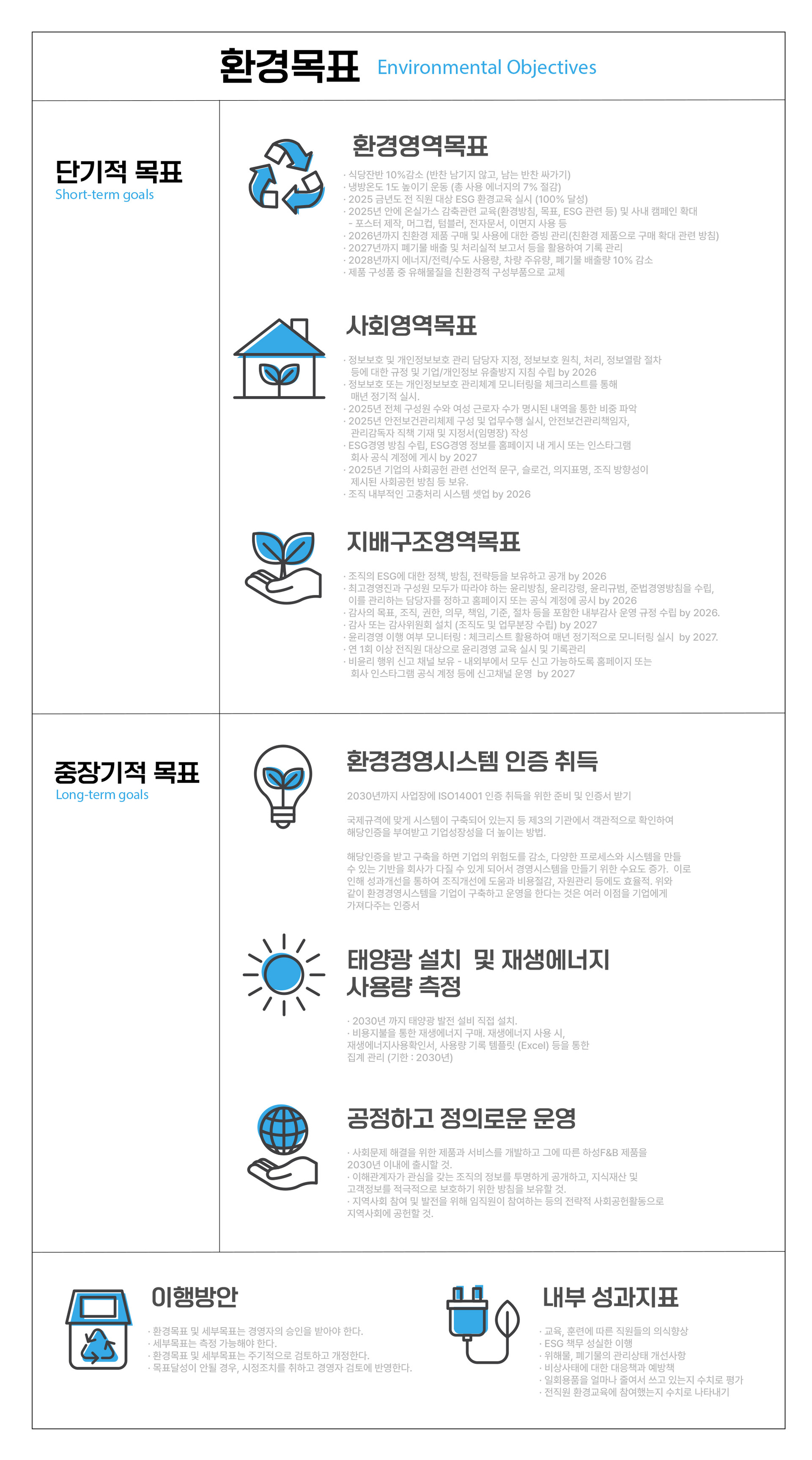 | 단기적 목표 Short-term goals | 환경영역목표 · 식당잔반 10%감소 (반찬 남기지 않고, 남는 반찬 싸가기) · 냉방온도 1도 높이기 운동 (총 사용 에너지의 7% 절감) · 2025 금년도 전 직원 대상 ESG 환경교육 실시 (100% 달성) · 2025년 안에 온실가스 감축관련 교육(환경방침, 목표, ESG 관련 등) 및 사내 캠페인 확대 - 포스터 제작, 머그컵, 텀블러, 전자문서, 이면지 사용 등 · 2026년까지 친환경 제품 구매 및 사용에 대한 증빙 관리(친환경 제품으로 구매 확대 관련 방침) · 2027년까지 폐기물 배출 및 처리실적 보고서 등을 활용하여 기록 관리 · 2028년까지 에너지/전력/수도 사용량, 차량 주유량, 폐기물 배출량 10% 감소 · 제품 구성품 중 유해물질을 친환경적 구성부품으로 교체 사회영역목표 · 정보보호 및 개인정보보호 관리 담당자 지정, 정보보호 원칙, 처리, 정보열람 절차 등에 대한 규정 및 기업/개인정보 유출방지 지침 수립 by 2026 · 정보보호 또는 개인정보보호 관리체계 모니터링을 체크리스트를 통해 매년 정기적 실시. · 2025년 전체 구성원 수와 여성 근로자 수가 명시된 내역을 통한 비중 파악 · 2025년 안전보건관리체제 구성 및 업무수행 실시, 안전보건관리책임자, 관리감독자 직책 기재 및 지정서(임명장) 작성 · ESG경영 방침 수립, ESG경영 정보를 홈페이지 내 게시 또는 인스타그램 등 회사 공식 계정에 게시 by 2027 · 2025년 기업의 사회공헌 관련 선언적 문구, 슬로건, 의지표명, 조직 방향성이 제시된 사회공헌 방침 등 보유. · 조직 내부적인 고충처리 시스템 셋업 by 2026 지배구조영역목표 · 조직의 ESG에 대한 정책, 방침, 전략등을 보유하고 공개 by 2026 · 최고경영진과 구성원 모두가 따라야 하는 윤리방침, 윤리강령, 윤리규범, 준법경영방침을 수립, 이를 관리하는 담당자를 정하고 홈페이지 또는 공식 계정에 공시 by 2026 · 감사의 목표, 조직, 권한, 의무, 책임, 기준, 절차 등을 포함한 내부감사 운영 규정 수립 by 2026. · 감사 또는 감사위원회 설치 (조직도 및 업무분장 수립) by 2027 · 윤리경영 이행 여부 모니터링 : 체크리스트 활용하여 매년 정기적으로 모니터링 실시 by 2027. · 연 1회 이상 전직원 대상으로 윤리경영 교육 실시 및 기록관리 · 비윤리 행위 신고 채널 보유 - 내외부에서 모두 신고 가능하도록 홈페이지 또는 회사 인스타그램 공식 계정 등에 신고채널 운영 by 2027 |